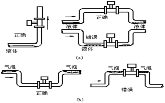 6. 測量氣體時(shí),在垂直管道安裝儀表,氣體流向不限。但若管道內(nèi)含少量液體,為了防止液體進(jìn)入儀表測量管,氣流應(yīng)自下而上流動,如圖(四)a所示