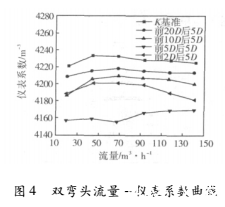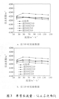 a.在雙彎頭的各工況中,前20D儀表系數隨流量的增加變化平緩,前10D和前5D有明顯上升趨勢,前2D有明顯下降趨勢,說明前10D、5D、2D的線性度較前20D的差。